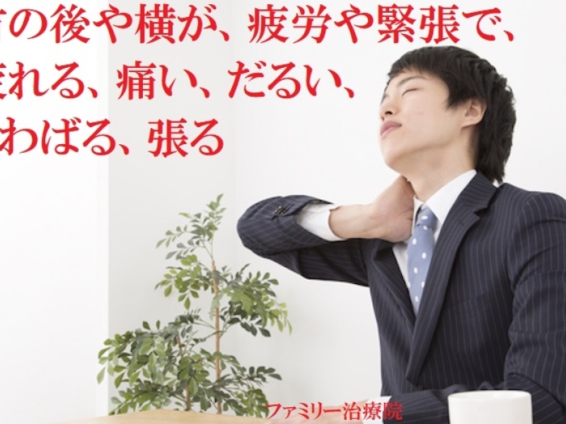 続きは、『首の後や横が、疲労や緊張で、疲れる、痛い、だるい、こわばる、張る( family-tiryouin.com/191016-2 )』を、検索してご覧下さい。