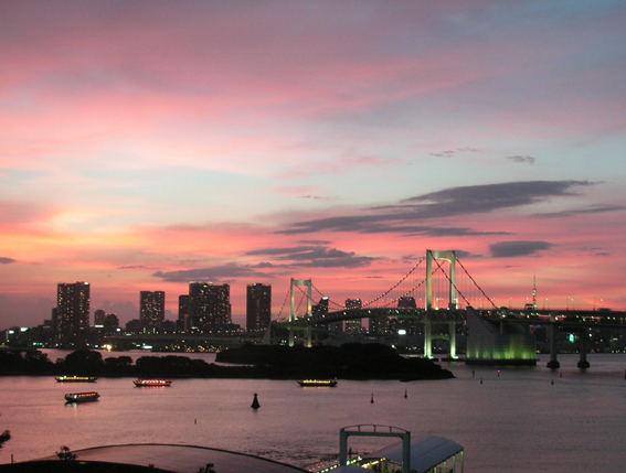 レインボーブリッジ側は 一面ガラス張りで、時間帯も良く夕焼けがオレンジ・ピンク・紫が入り混じり、幻想的な夜景でした(^^)