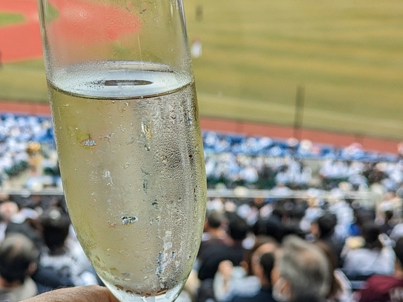 VIPルームでウェルカムドリンクのシャンパン&ロッテのお菓子付き!帽子とタオルも配布されました。