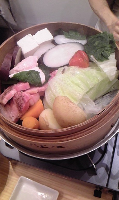 ぽちぱぱが沖縄でエンジョイしてるころ、 ぽちままは、表参道で友達にお誕生お祝いをしてもらってました。 ぽちままはベジタリアン寄りなので、それを熟知している友達のお店のチョイスはお見事でした! 野菜蒸し・・・というのが正しい表現なのでしょうか? 定番の野菜に、一つだけ好きな野菜をチョイスできて、友達は黒大根。ぽちままは茄子。 それと、お肉か魚を1品のせられて、今回は、ささみとベーコンにしました。 数分、それを蒸し器で蒸す。 ただ、それだけなのですが、つけて食べるソースも銃数種類から選択できて、それにつけて食べると、超美味しい!! 野菜を全部食べると、その野菜から落ちたエキスで卵雑炊を作ってくれます。 そのスープが、またいいお味! 文句なく、また行きたいお店。 ただ、雑炊が少ない気が・・・・なので、あえて満点はずしました。 雑炊をもう少し増やしてください〜